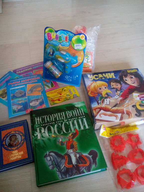 Итак,по составу: знаменитая уже игра Усачи)))) поддалась всеобщему вниманию к ней, качество радует,идея классная. Старший сын очень любит настолки,особенно весёлые и на внимание,да ещё и можно маму с папой подключить!!! Покупкой довольна! Далее - отпадная книга по истории войн!!!со скидкой вышла 120 рублей))) 290 иллюстрированных страниц!!! Боюсь,старшему сыну не скоро достанется,т.к. муж уволок книгу со словами:"классная!!! Буду читать!!!" следующее - пистолет с пузырями ,жидкость для мыльных пузырей,ножницы и формочки для пластилина - подарок для младшего сына,думаю,оценит. И на последок,дидактический материал от Рыжего Кота,у меня уже вся серия! Сыну очень нравиться перебираться карточки. Картинки яркие,картон плотный,а учитывая цену на одну книгу(15 рублей!!!) вообще красота! На фото нет воздушного змея от Бондибон(ястреб), это просто красавец! Обещаю фотку в действии! Ну и ещё пару фоток разворота книги если кому интересно....