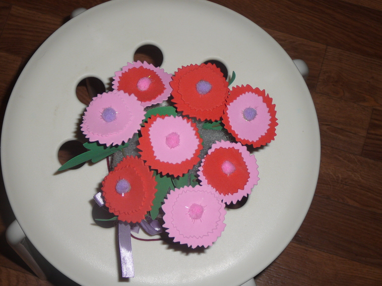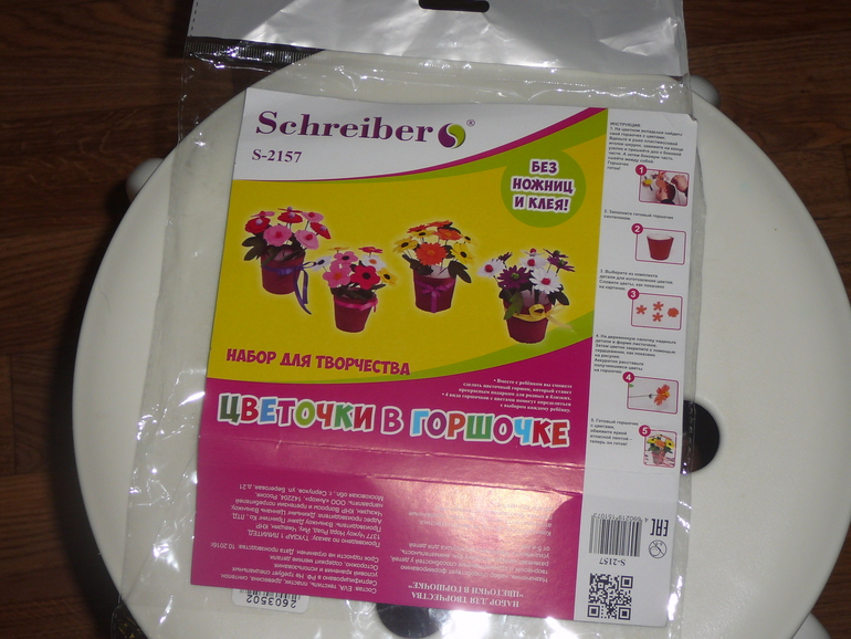 Очень любим мы с дочкой что-нибудь этакое мастерить.Вот и в этот раз заказала на пробу этот набор.Фото набора в полной комплектации не прилагаю,т.к. дочь вскрыла его сразу,видимо любопытство взяло вверх.Опишу содержимое набора. Упакован в пленку(видно по фото),в набор входит безопасная пластиковая игла,нитка для сшивания кашпо,несколько листов с ЕВА материалом четырех цветов (розовый,красный ,зеленый и коричневый),8 палочек-держателей для цветов,наполнитель для кашпо,маленькие помпоны и лента для украшения кашпо).Все действительно собирается без ножниц и клея,как и написано на упаковке(только тычинки-помпоны мы посадили на клей).Мастерили вдвоем с дочкой,особенно ей понравилось собирать цветы.Они нормально держатся в наполнителе,не выпадают.На упаковке видно,что набор идет в ассортименте.Нам результат понравился,поэтому будем покупать еще,можно смастерить такие подделки бабушкам в подарок.Еще и цена порадовала,с накопительной скидкой мне обошелся чуть больше 80 рублей.Рекомендую!