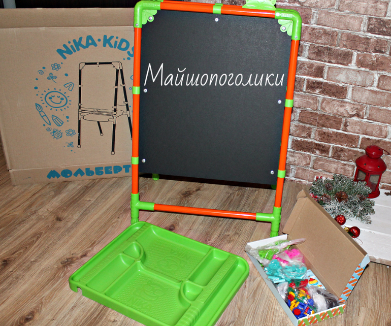 В комплекте: держатели для бумаги - 2 штуки, мелки - 3 штуки, мозаика - 100 штук (4 цвета), магнитная азбука - 96 штук (3 цвета).