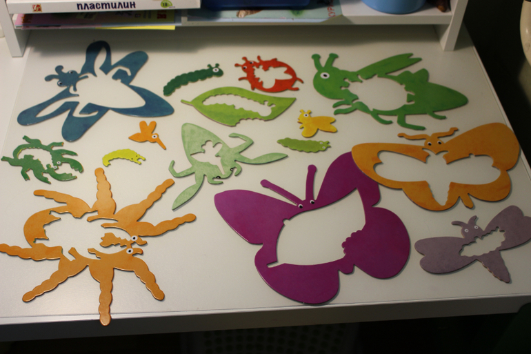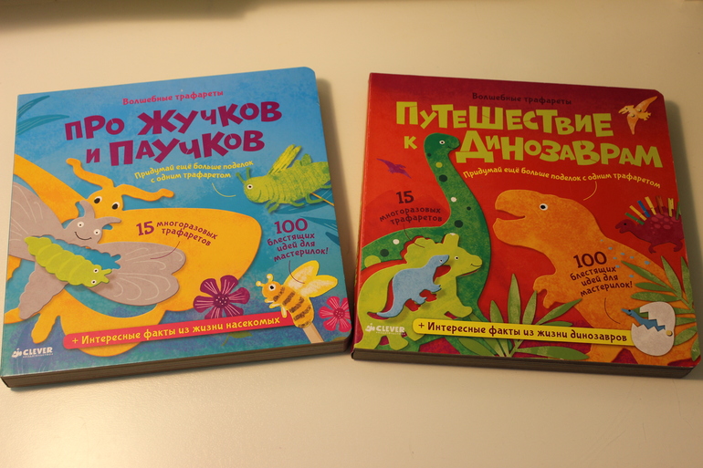 Долго сомневалась, стоит ли брать, цена все же не маленькая, но наконец моя жаба была побеждена и я купила два экземпляра. В первую очередь, я взяла их для поделок и аппликаций, ребенок просто обожает это дело (как раз накануне я запаслась разными видами цветного картона). Но сегодня весь день сын их раскладывает, собирает один в другой, рассматривает, что-то рассказывает. Не знаю, когда собственно, дойдем до творчества). Особенно сына впечатлили насекомые. В книге очень толстые страницы, сами трафареты конечно не такие, но все же из плотного картона. На разворотах можно найти интересные идеи поделок, хотя думаю, что здесь вообще не ограниченный простор для творчества. Даже просто обводить их ручкой в альбоме - уже огромная польза для детской ручки. А для таких не творческих мам, как я (к слову даже букашку не могу нарисовать) это просто находка! Еще меня посетила мысль, что с помощью таких трафаретов, можно устроить тематический день рождения ребенку - по крайней мере украсить стены комнаты, наклеить вырезанные фигурки на шпажки для кексов и закусок, да и много чего еще. И театр теней конечно!