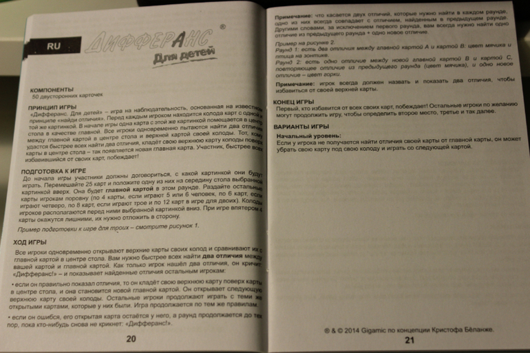 Игра "Difference Junior". Игра на поиск отличий. У сына эта тема пока не сильно любима, но карточные игры мы любим. В комплекте 50 двухсторонних карточек, но сюжета всего четыре. Правила сфотографировала, чтобы не расписывать. Качество у игры отличное, упакована в красивую жестяную компактную коробочку, карточки не сильно плотные, но качественные.
