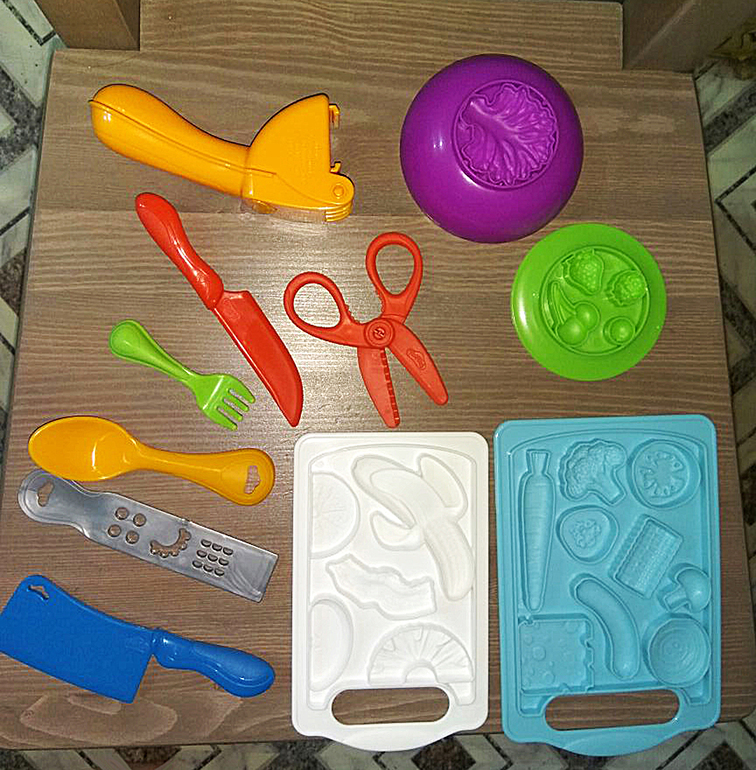 Сама бы с удовольствием в такой набор играла. Ножницы имеют зигзагообразные лезвия. Выемки-шаблоны (вот не могу придумать, как их назвать правильно), на досках, только с одной стороны. И еще понравилось, что на тарелках, с обратной стороны, так же есть шаблончики для лепки. Набор, будет достойным продолжением, к нашей коллекции от Play-Doh, а может быть даже и любимым станет (внутренний голос подсказывает).