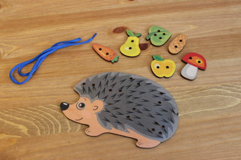 Шнуровка "Ежик". Сыну очень понравилась эта шнуровка. Сделана из фанеры, аккуратно раскрашена, дырочки ровные. Размер небольшой.