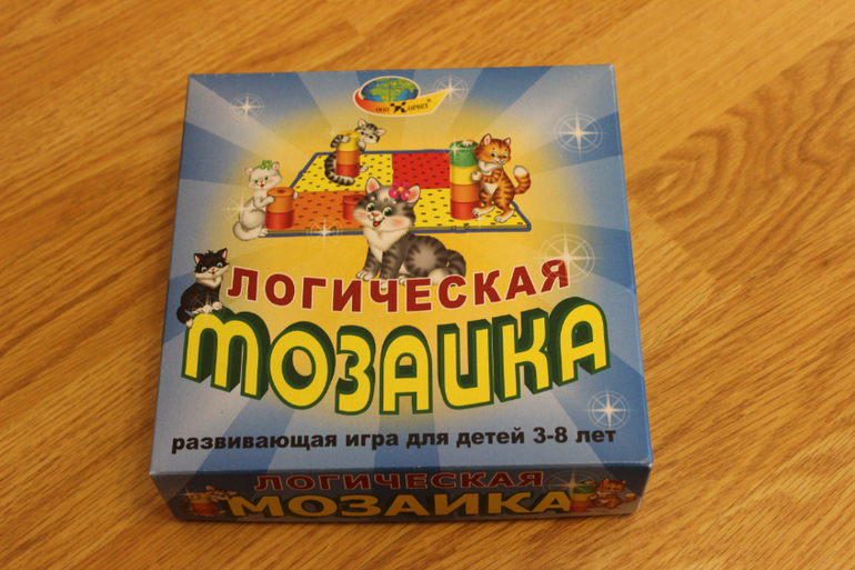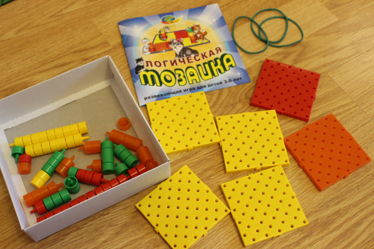 Логическая мозаика Корвет. Рада, что этот производитель появился снова в МШ. В свое время караулила там логические блоки Дьенеша, пришлось заказывать в другом месте. Мозаика понравилась, необычна она тем, что детали можно втыкать не только в поле, но и в друг друга, строя вертикальные конструкции. В наборе игровое поле из 6 небольших квадратов (4 желтых, 1 красный и 1 оранжевый), 72 детали 4-х цветов, три резиночки и книжечка с примерами игр и занятий. Пособие компактное, нам очень понравилось.