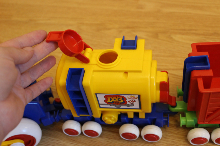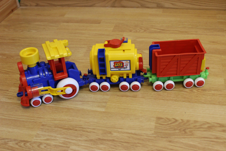 Паровозик "Ромашка" с двумя вагонами, Форма. Вот, о чем я жалею, так это о том, что не купила его раньше. Очень крупного размера, длина 53 см! Два вагона - грузовой и цистерна. У цистерны откидываются крышечки, у грузового вагона сзади открывается крышка и там хранится небольшая черная лопатка. В сам паровозик можно посадить человечка (входит в комплект). Как у настоящего старого паровоза, у него есть поршни, они подвижны, это очень круто. Сзади кабины есть колокольчик, но он пластмассовый, поэтому звука не имеет. Колеса, как у почти у всей техники от Формы резиновые, тяжелые и не убиваемые.