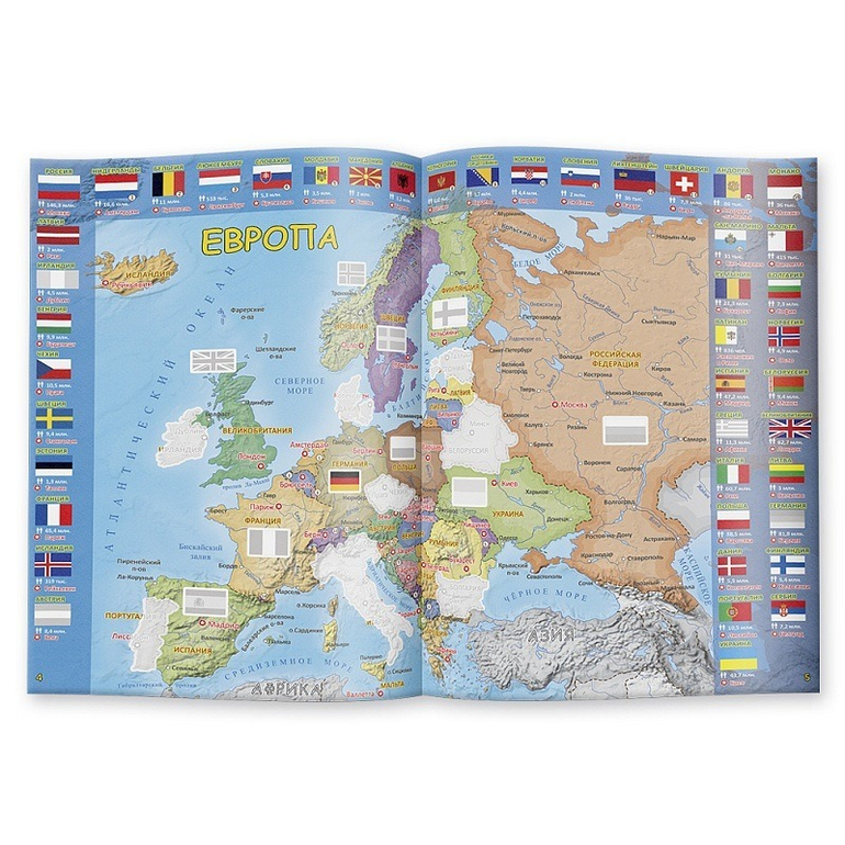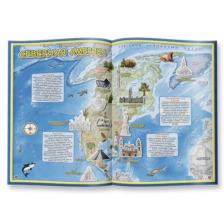 И еще этого же производителя два атласа мира с наклейками "" (здесь надо просто найти на карте страну и приклеить наклейку либо с самой страной, либо с ее флагом) и "" (здесь так же кратенькая информация о достопримечательностях и нужно найти на карте их месторасположение и приклеить наклейку).