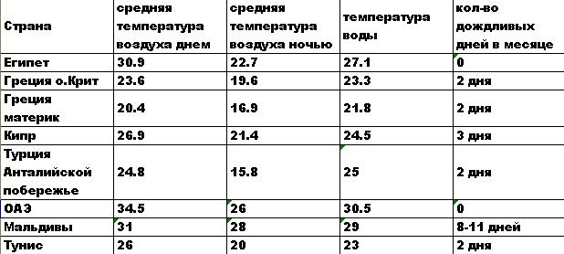Для начала просто хочу предложить вам небольшую таблицу, в которой постараюсь отразить погоду по разным популярным направлениям, чтобы уже сразу вы имели представление:)