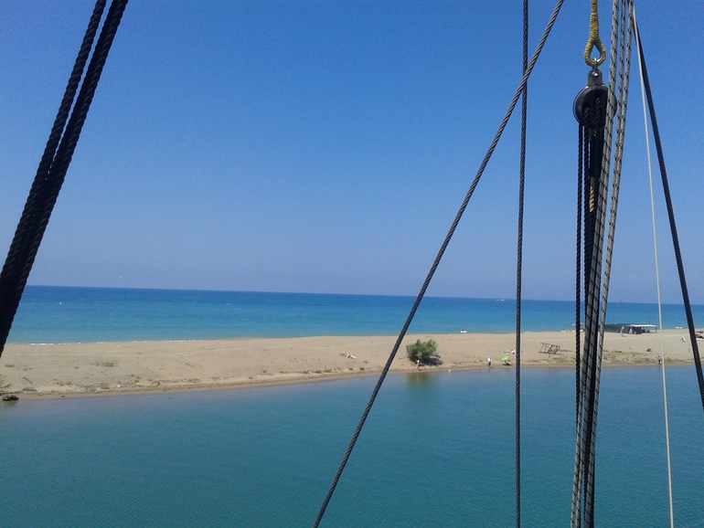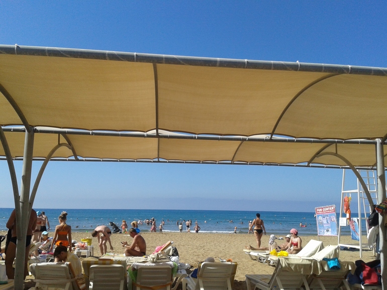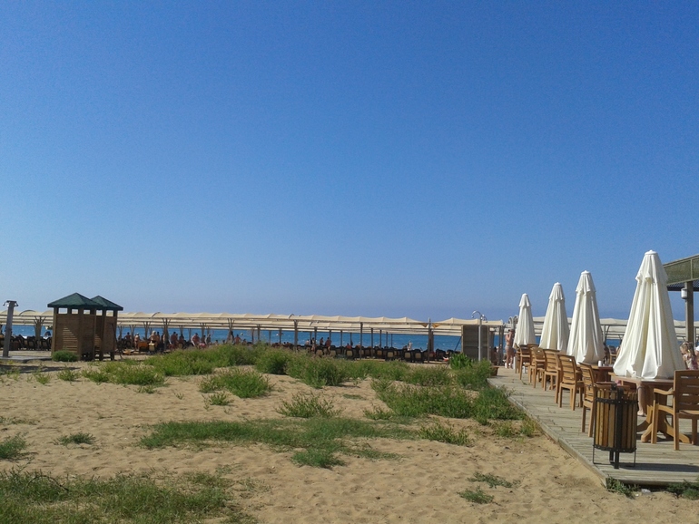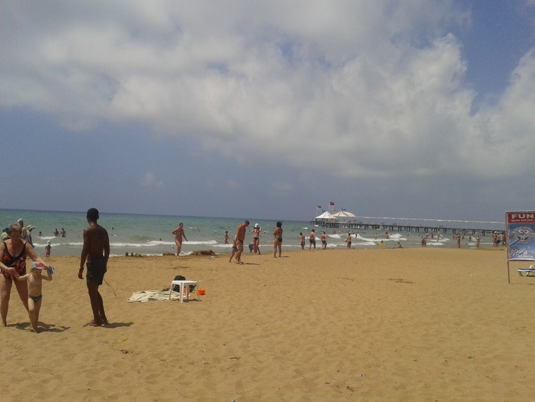 Ну и сразу рванули на море. Т.к. отель находится на второй линии, то добирались мы до него на автобусе. Ходит он не по расписанию, а курирует по кругу. Ждать минут 5 и едет ровно 3 минуты (засекала). Пляж шикарный! Для детей самое оно, песочек, долгий вход, вода чистейшая. Именно там моя 4х летняя дочь научилась плавать к концу отдыха! Горжусь ей).