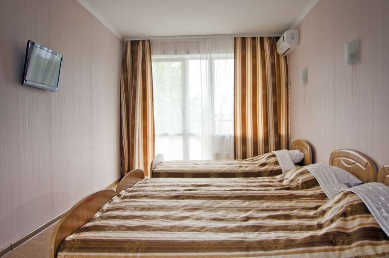 Уникально и расположение отеля. В поселке Угловое морская вода прогревается быстрее, чем на южном берегу Крыма. Сочетание мягкого морского климата и сухого степного способствуют лечению и профилактике заболеваний органов дыхания.