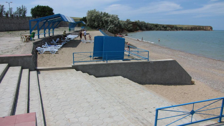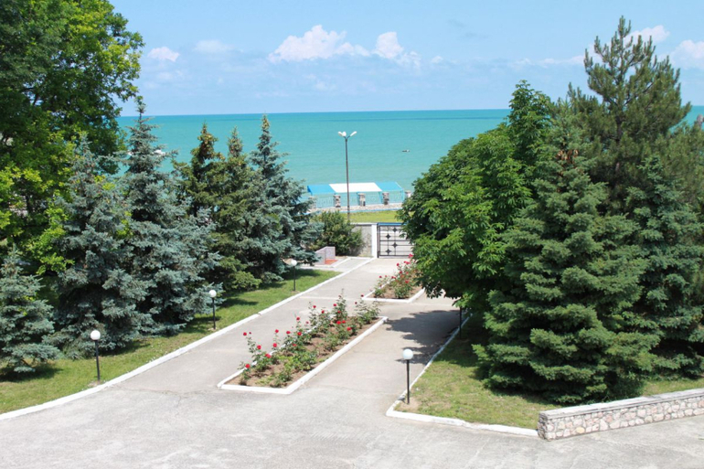 Собственная выделенная зона (верхний ярус) пляжа в 50 м. от корпуса, оборудованная навесами, лежаками и кабинами для переодевания. Постепенное изменение глубины моря, пляж песчано-галечный.