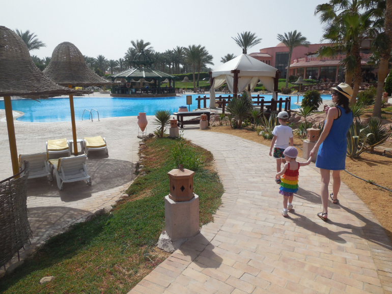 Начну с перелетов. Вылет в Египет был в 3.10 ночи из Домодедово. Т.к. мы из Подмосковья, то выехали еще с вечера. Вылет немного задержали, минут на 20. Самолеты у Метроджет маленькие, 2 ряда кресел, бизнес-класса нет. Для меня это не принципиально. Зато команда бортпроводников очень приятная! Дочка летела первый раз, уже сильно вымоталась ко времени взлета + отключили освещение в салоне и она выдала истерику при наборе высоты ((( Ничем успокоить не получалось, вставать нельзя, все вокруг возмущаются... вобщем ужас... Когда самолет набрал более-менее высоту, нам с ней разрешили встать и проводили в отсек для персонала. Стюарды пытались развлечь, чем могли. По-тихоньку, ребенок успокоился, соориентировался в пространстве, и мы смогли вернуться на место. Честно говоря, я никак не ожидала от неё такой реакции. Она отлично переносит дорогу в машине, регулярно ездим к бабушке-дедушке по 5-6 часов. А здесь, видимо, наложилась усталость, темнота, может, ушки заболели и ребенок испугался. Кормили завтраком ( блинчики и омлет). Вторую половину полета дети и муж спали, а я пыталась уснуть ))) В аэропорту Шарма пришлось постоять в очереди сначала за бланками для визы, а потом на постановку этой визы. До отеля ехать минут 15, с учетом заезда еще в 2 отеля по пути. По приезде мужу предложили за 20 $ улучшенный номер вместо нашего стандарта. Мы согласились. Номер просторный. В нем одна огромная ( по моим меркам) кровать и раскладывающийся диван, ТВ с 3-мя русскими каналами, мини-холодильник, сейф, стол, кресло, письменный столик, санузел, есть балкон. Предлагали кроватку для младшей, но мы не стали брать, т.к. и дома спим вместе. Мебель не новая, но все работает исправно, нареканий нет. Однажды у нас сломалась сливная система унитаза. После звонка на ресепшен, через 5 минут пришел мастер и все починил. Вообще, к работе персонала у меня претензий нет. Все вежливые, улыбаются, не назойливые , не приставучие ( чего нельзя сказать о продавцах за пределами отеля ).