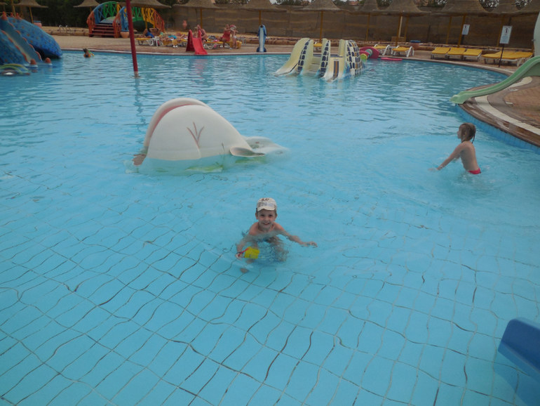 Немного остановлюсь на еде. Т.к. это первый наш отдых, то сравнить мне не с чем, но еды нам хватало всегда. Больше всего мне нравился завтрак, жарили вкусный омлет и глазунью ))) Всегда были рис, макароны и картошка в разных вариациях, отварные овощи, супчики, курица, говядина, иногда рыба или кальмары, на завтрак овсянка, творог, жидкие йогурты, разные хлопья с молоком. По поводу питания детей, я не могу дать однозначной оценки. Все зависит от ребенка и выбора родителей. Например, мне было проще накормить там младшего ребенка, чем старшего. Сын у меня довольно привередлив в еде, не любит никакие соусы… а там в чистом виде только рис и жаренная картошка. Его любимые макароны всегда уже с томатной пастой или молочным соусом. Мои дети с удовольствием уплетали там огурцы ))) Большой выбор и разнообразие выпечки! Я там так «подсела» на пироженые, что дома началась « ломка» =))) Большим плюсом для меня стала возможность выносить еду из ресторана. Мы регулярно брали фрукты и булочки в номер. Кроме основных приемов пищи в барах у бассейнов аквпарка и на пляже готовят пиццу, картошку фри, гамбургры, рыбку в кляре, можно взять чай, кофе, воду и другие напитки. По поводу алкоголя ничего особо сказать не могу. Я не пью, муж брал пиво, говорит крепость градуса 2 не больше )))