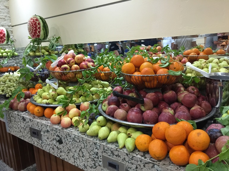 Теперь про еду: кухня порадовала, огромное разнообразие фруктов (яблоки, груши, виноград, сливы, инжир, арбузы, дыни, мандарины)