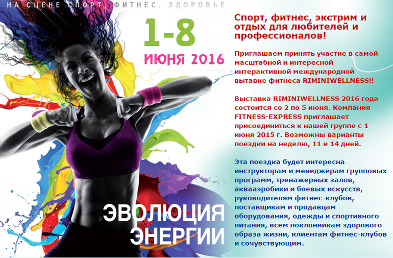 FITNESS-EXPRESS является первой компанией в России, организующей группы для поездки на эту выставку. Наши группы постоянные участницы RiminiWellness с 2004 года. Ежегодно от 50 до 80 участников со всей России выезжают в Италию с FITNESS-EXPRESS. С нашими группами путешествуют известные Российские презентеры, выступающие на конвенциях RiminiWellness и у вас будет возможность познакомиться и пообщаться с ведущими российскими преподавателями.