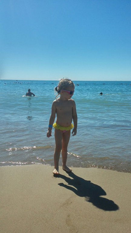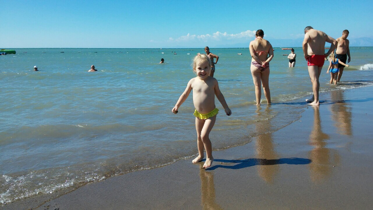 Он прекрасен. Чистый, песчаный. Лежаки новые и удобные.. Есть в некоторых местах вдоль побережья галька и дочка занималась поисками ракушек.. Плавный вход в море..