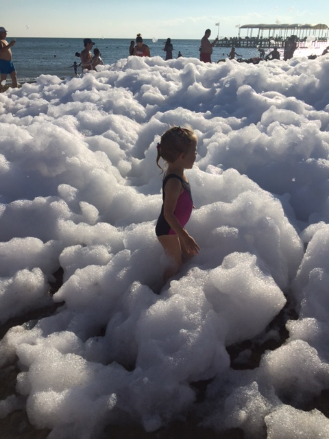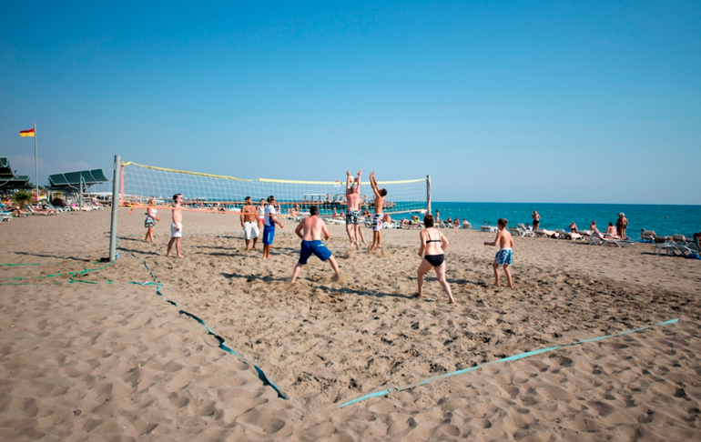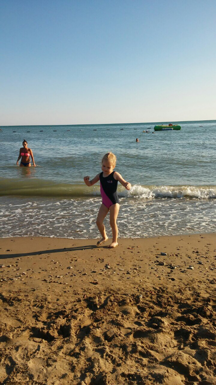 На территории пляжа есть детская площадка под тентом, волейбольная площадка и спасатель, который периодически выходит к кромке моря во второй половине дня, когда появляется ветер и появляются волны..