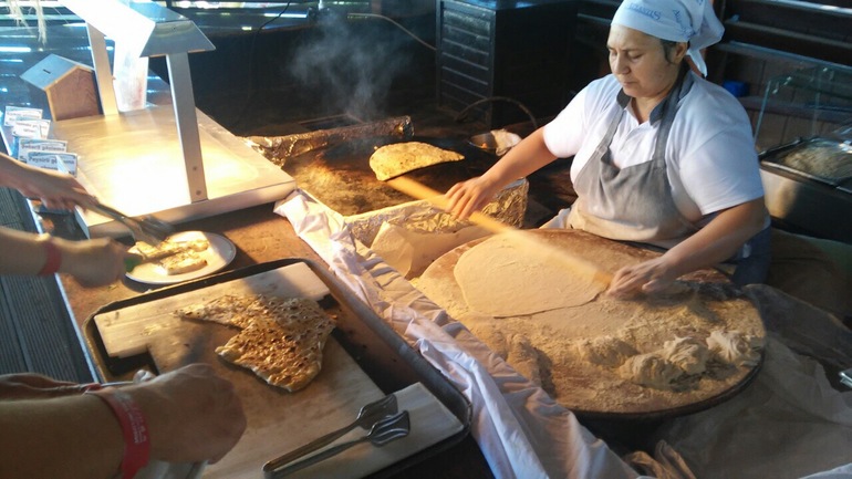 Ну и лепешки! Выкладывают с сыром, мясом, зеленью и картошкой. Рядом чай, кофе и айран..