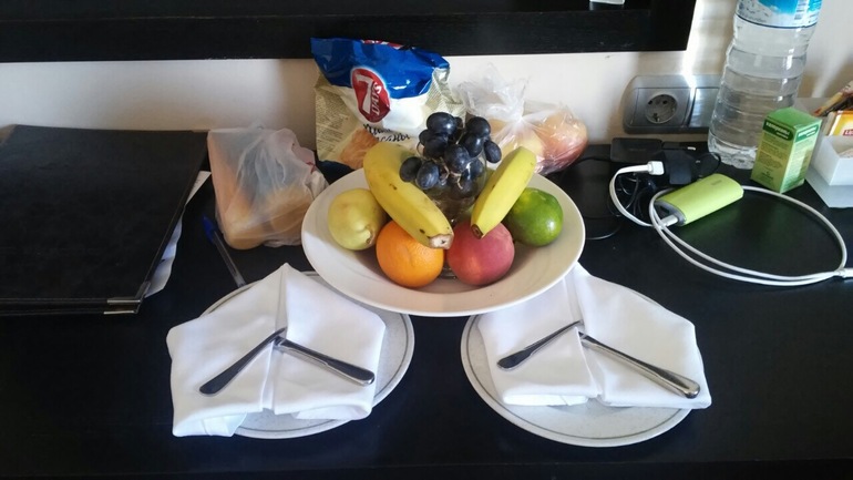 Чуть позже появилась табличка, в которой было написано, что в любое удобное нам время нам принесут тарелку с фруктами, как комплимент от отеля.. Надо было просто позвонить по номеру, указанному на табличке.. И вуаля! Мелочь, но приятно...