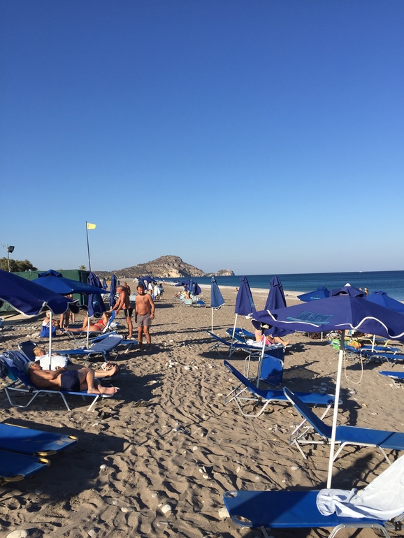 Лежаки и зонтики бесплатные, это плюс для Греции. Бесплатны и пляжные полотенца, но меняют их только раз в 3 дня, причем на их выдаче сидит такой серьезный дядечка, у которого все записано и сменить полотенце раньше, думаю, такой номер у него не прокатит. На пляже нет туалета, он есть в баре в 100 м, что равно расстоянию до отеля. Бара на пляже тоже нет, только кулер с водой. Душ и раздевалка есть. Пляж песчано-галечный. Граждане с нежными стопами ходили в специальной обуви. Есть бесплатный прокат байдарок и катамаранов.