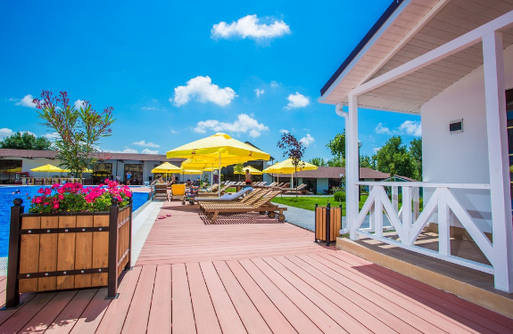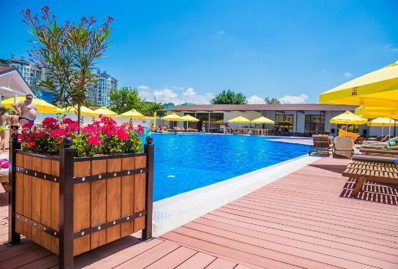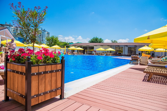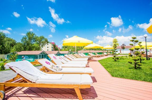 Территория вокруг бассейна оснащена большими зонтами, лежаками с мягкими матрацами. Рядом с детским отделением бассейна есть песочница для малышей, качели под навесом и площадка с искусственной травой, идеально подходящая для игр на свежем воздухе. Около бассейна работают аниматоры, программа которых рассчитана на гостей всех возрастов. Мы подготовили для Вас развлечения на любой вкус!