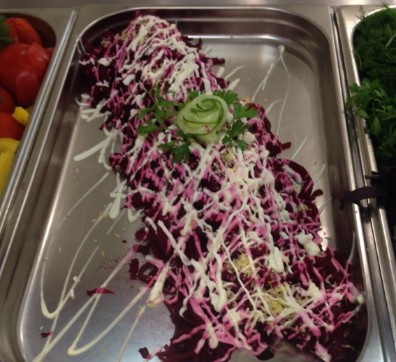 - мясные салаты (салат с бужениной, макаронами и курицей, с куриной печенью, фунчоза с мясом, «Оливье» и «Цезарь»).