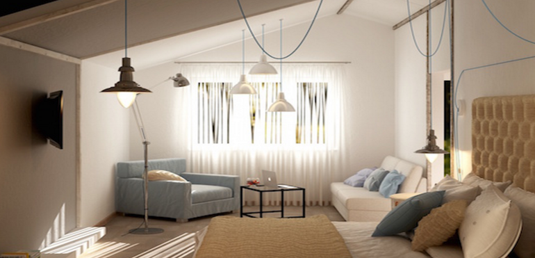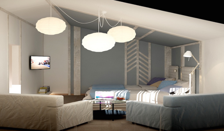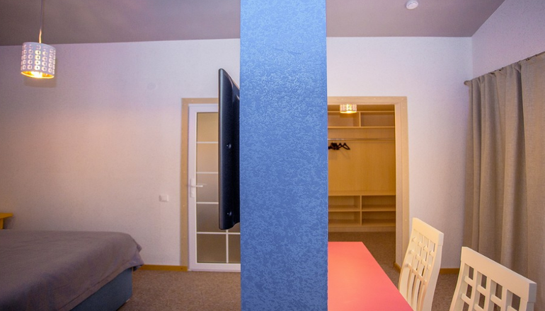 Номер на двоих с одной большой кроватью. Яркие элементы интерьера поддерживают в доме радостное настроение.