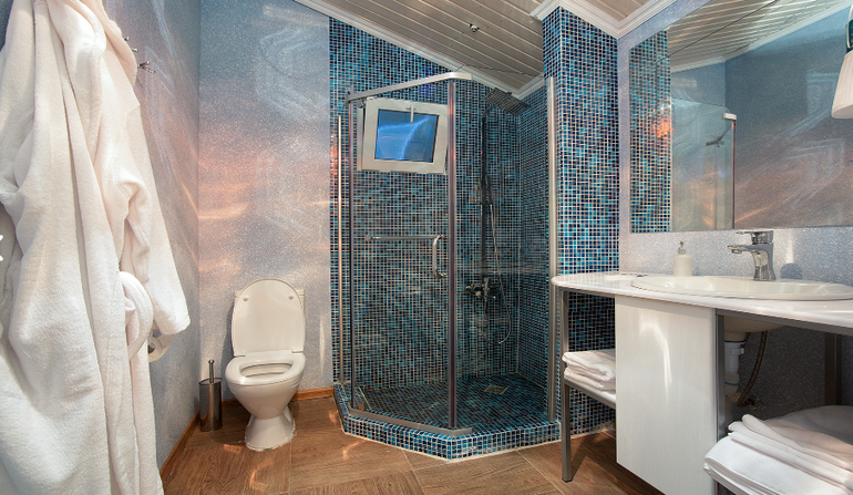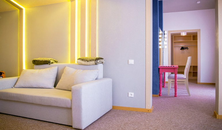 Двухкомнатный номер площадью 56 кв.м. состоит из гостиной, спальни, двух санузлов, в одном из которых установлена полноценная ванна и гардеробной, достаточно вместительной для любого багажа.