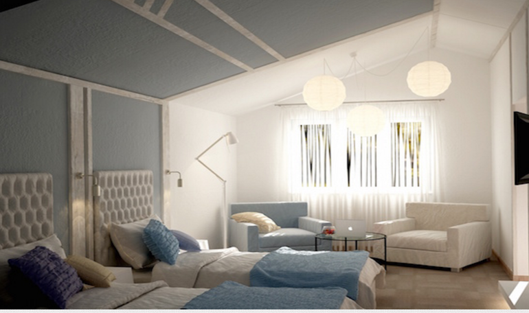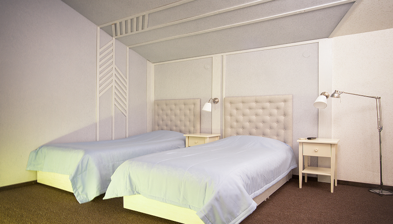Номер на двоих с двумя раздельными кроватями. Морские оттенки в оформлении настраивают на спокойный, расслабленный отдых.