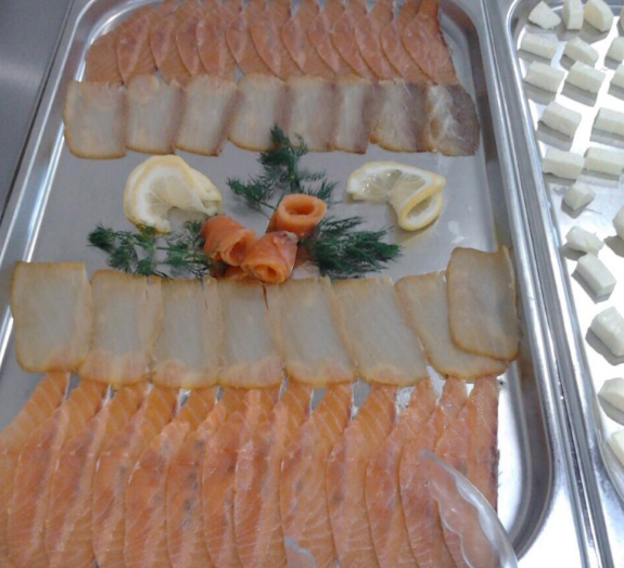 - рыбная тарелка из малосольной семги и копченой масляной рыбы.