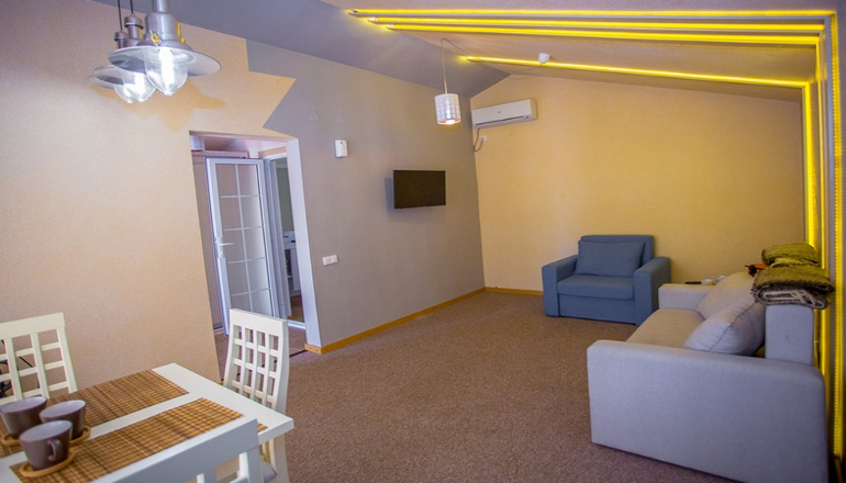 Номер из двух смежных комнат, с двумя ванными и двумя входными дверьми. Хорошо подойдёт для одной большой семьи, двух маленьких семей или весёлой компании.
