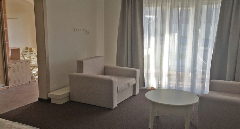 Два телевизора, мини-бар, собственная терраса не дадут вам скучать в плохую погоду. Мини кофе-машина позволит насладиться вкусом Nespresso в любое время дня и ночи, а большие пространства дадут возможность родителям отдохнуть вдвоем, уложив детей в отдельной комнате.