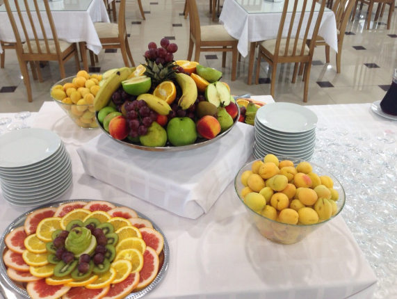 Неотъемлемой частью завтрака станут свежие фрукты и ягоды (ананасы, киви, яблоки, абрикосы, виноград, черешня), которые Вы всегда найдете на столе: они наполнят Вас витаминами и зарядят энергией на весь день.