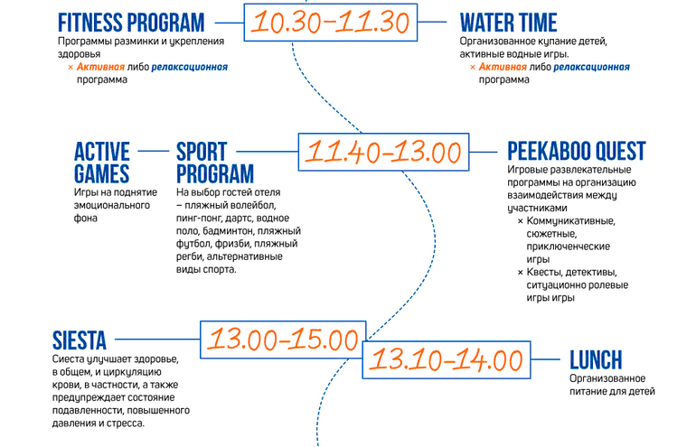 Одновременная организация детской, взрослой, семейной анимации в отеле. Анимационная программа организована таким образом, чтобы в разных точках территории отеля люди разного возраста и вне зависимости от настроения в течение всего дня нашли для себя мероприятие по вкусу, начиная от технической анимации (фитнес, йога, спортивные игры, образовательные шоу - программы и дискотеки) и заканчивая образовательными студиями и авторскими арт-играми.