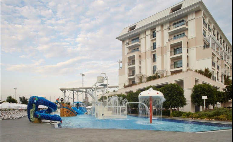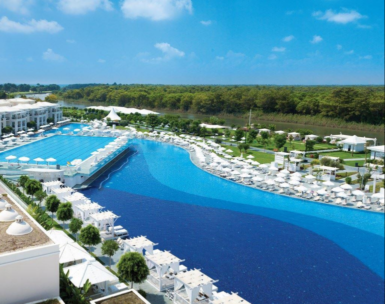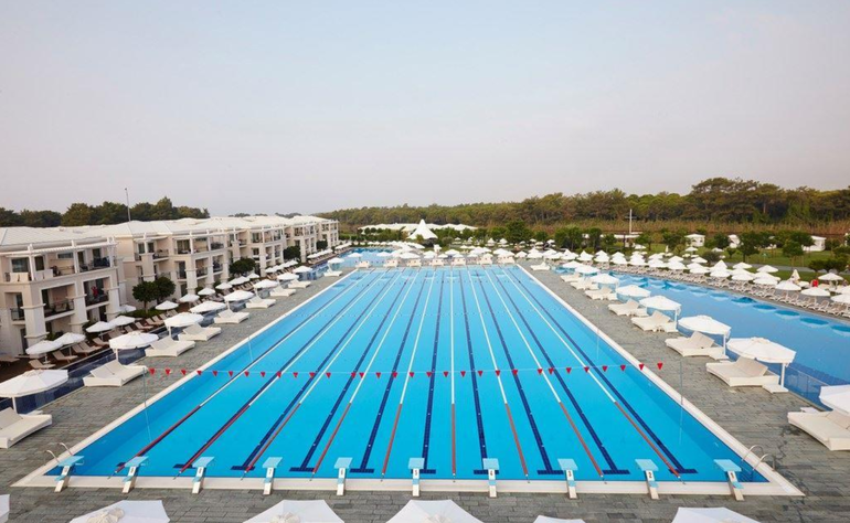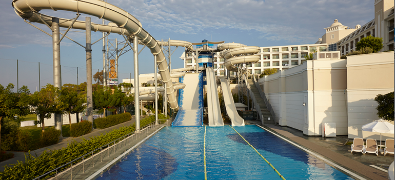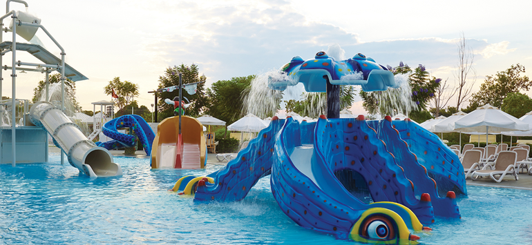 - открытые бассейны: главный 8138 кв.м, олимпийский 1250 кв.м, бассейн с морской водой 655 кв.м, бассейн с горкой для взрослых 300 кв.м, детский бассейн в Tini Kids club 52 кв.м, детский бассейн развлечений 467 кв.м, детский семейный бассейн 65 кв.м