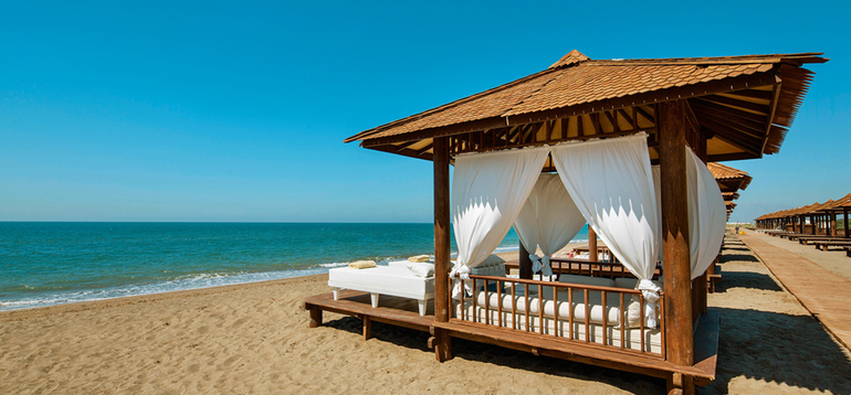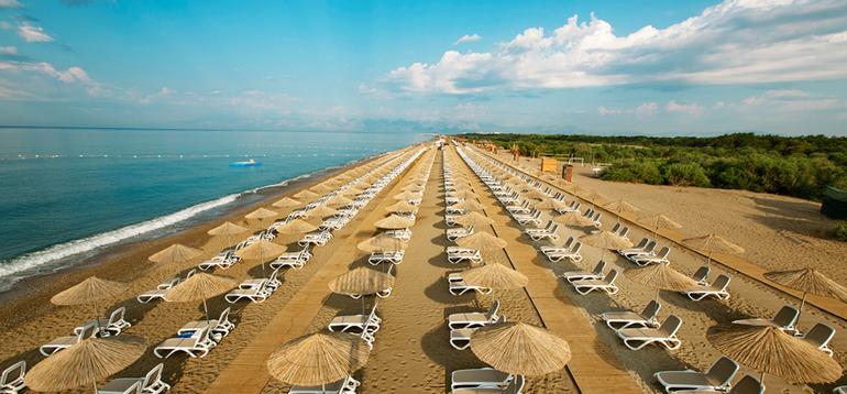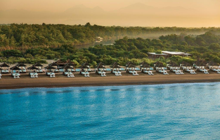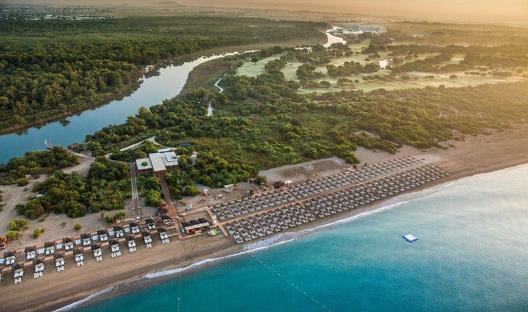Собственный песчаный пляж, находится в 1,2 км от отеля. Протяженность пляжа составляет 1 км. Курсирует шаттл на пляж и катер по реке (3-7 мин.), в течение дня, бесплатно. Шезлонги, зонтики, пляжные полотенца - бесплатно. Павильоны Cabana и Gazebo - платно. Душ, кабины для переодевания. Заход в море - песок, мелкая галька.