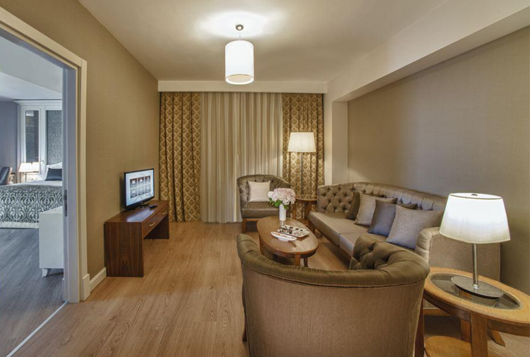 - 6 Suite (50 кв.м) спальня с гостиной, 2 спальни с дверью, 2 ТВ, джакузи в спальне, макс. 3 чел.