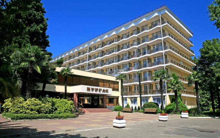 Пансионат «Бургас»*** - это современный гостиничный комплекс, имеющий собственный многопрофильный медицинский центр и уникальную инфраструктуру. «Бургас» расположен на самом берегу Черного моря в курортной зоне Адлерского района города Сочи, в 20 минутах езды от центра города Сочи и международного аэропорта, в 15 минутах - от железнодорожного вокзала. В апреле 2013 года пансионат прошел международную сертификацию на соответствие категории 3 звезды.