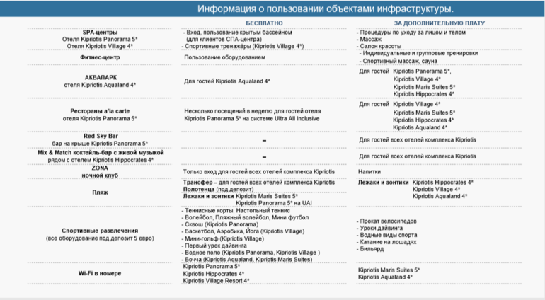 Общая сводная таблица по услугам для всех отелей комплекс.