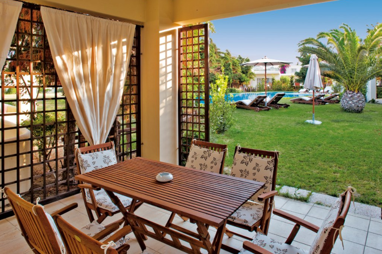 - Executive suite - роскошный люкс на первом этаже, открытый для безмятежных прогулок в саду. Отдельная спальня с двумя односпальными кроватями и гостиная/обеденная зона с одной или двумя односпальными диванами-кроватями и полностью оборудованной мини-кухней. Рассчитан на проживание до 4х человек.