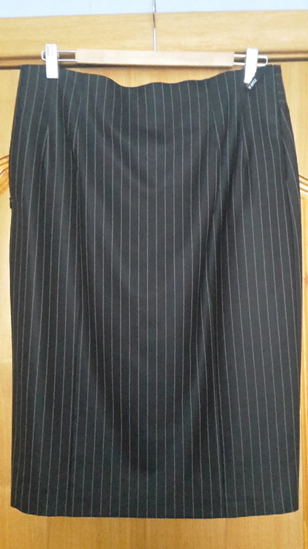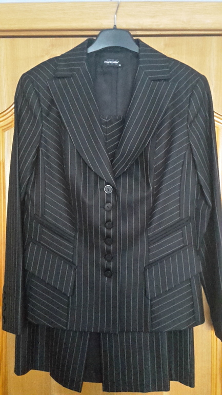 НОВЫЙ костюм Tom Klaim 50 размера. Подойдет на размер 48-50. На юбке разрез спереди. Цвет черный в светло серую тонкую полосочку. 3500 руб.