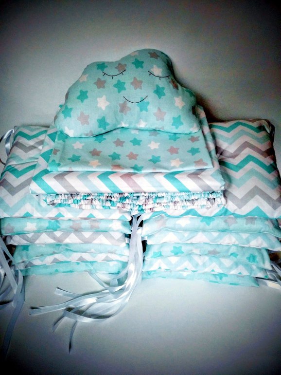 Комплект постельного белья и бортики в кроватку из белорусской бязи. В комплект входит простыня на резинке 120х60, наволочка 60х40, пододеяльник 140х110, 12 подушек 30х30 на 4 стороны кроватки и бонус в виде подушки-облачка. Внутри подушек гипоаллергенный холлофайбер. Изготовлен на заказ. Возможен повтор. СПб, Почта, ТК.