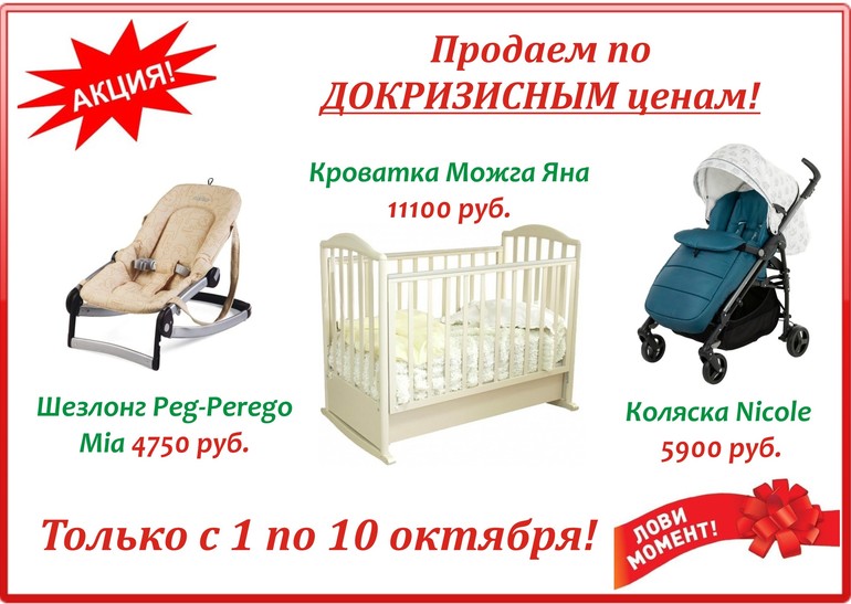 До конца октября мы снизили цены на 10-15% на товары для детей: по акции Вы можете купить с хорошей скидкой коляску, автокресло, ходунки, манеж, стульчик и многое другое. В акции участвуют марки Hauck, Nania, I'coo и Lana Care. А также скидки на развивающие коврики и игрушки