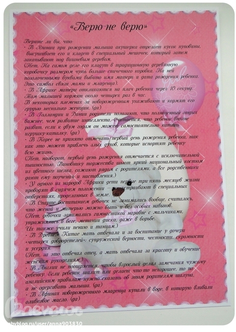 На плакате размещаются фотографии мамы и папы, а также фото Вашей малышки. Внизу гости смогут отмечать галочками чьи же глазки, ушки, носик и т.д. у Вашей доченьки - мамины или папины? А после подсчета голосов делается итоговый вывод о том, на кого же из родителей именинница похожа больше.