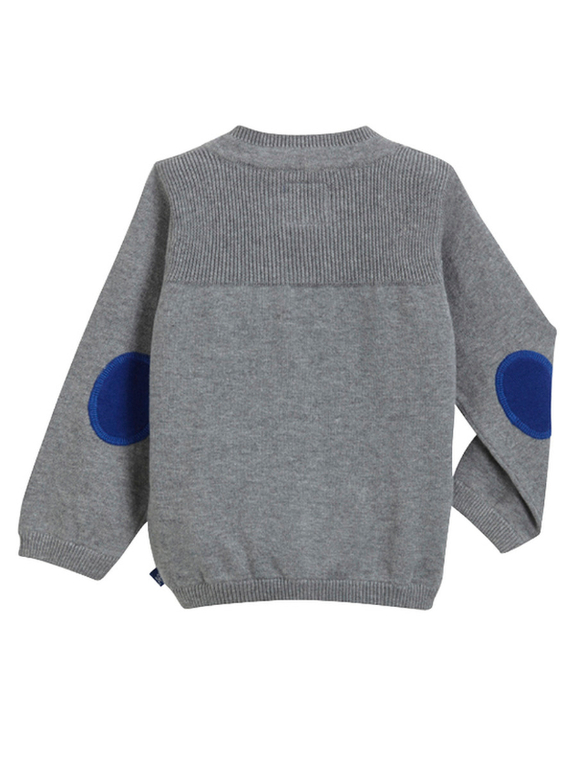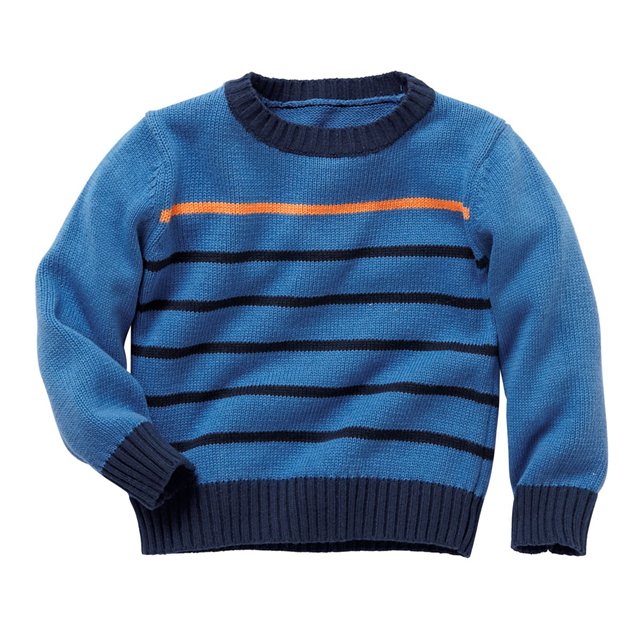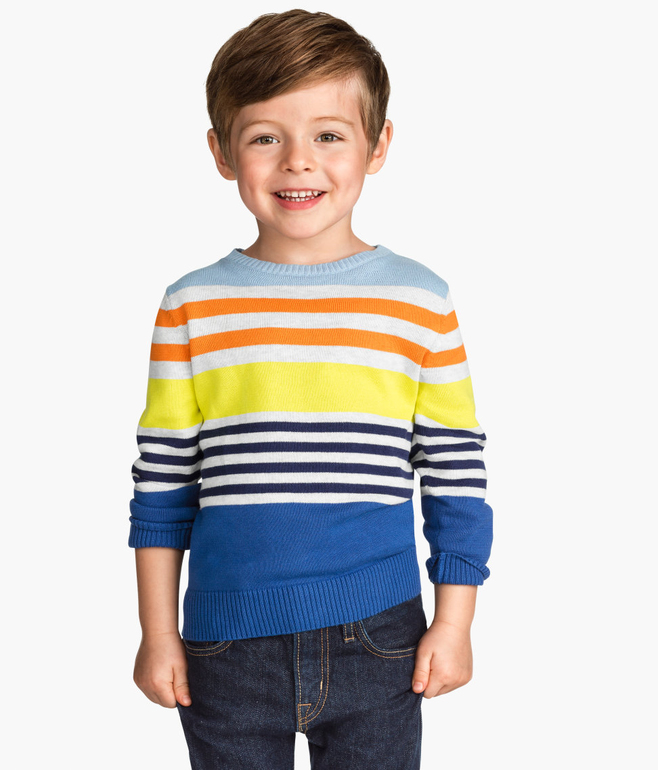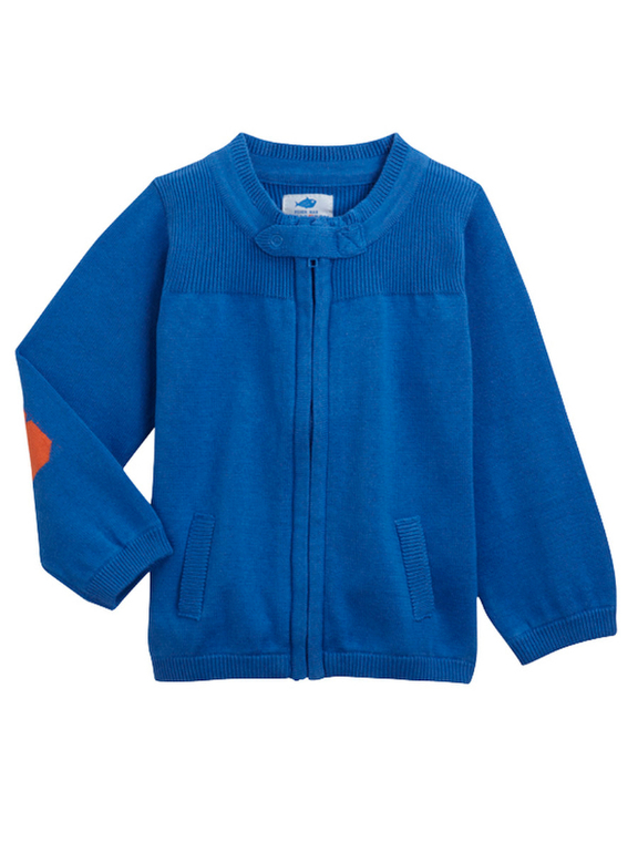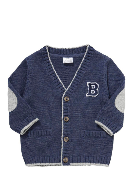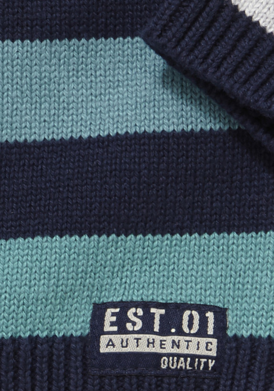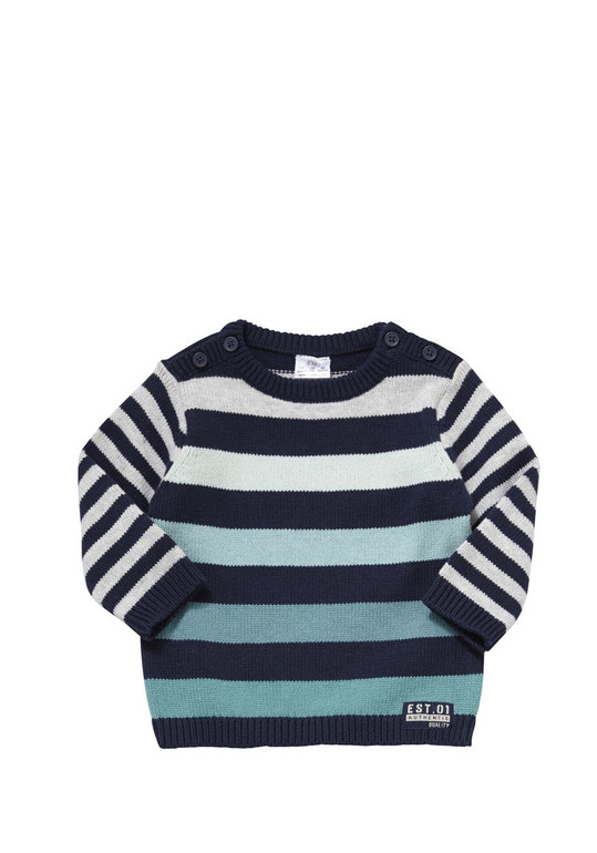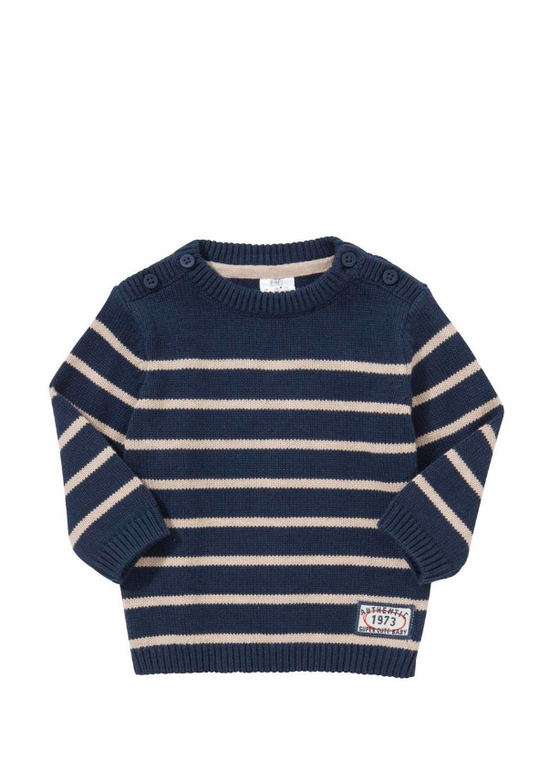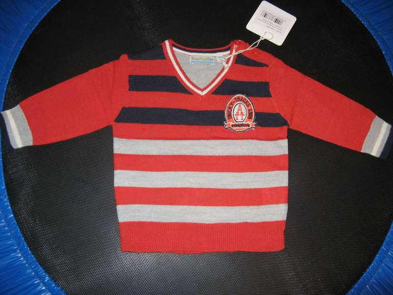 Джемпер вязаный фирмы F&F. Темно-синие и синие полоски, кармашек на груди, декоративные заплатки на локтях. Состав 100% хлопок. Размеры 1,5-2г (86-92)