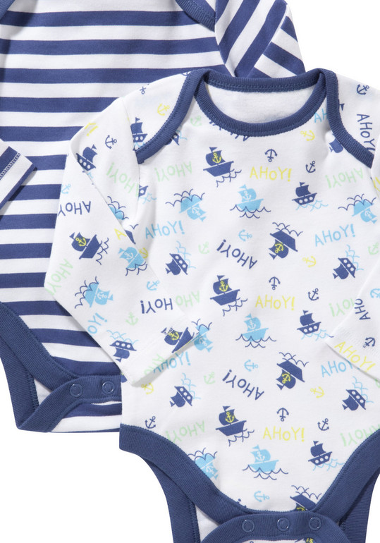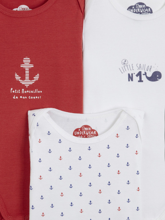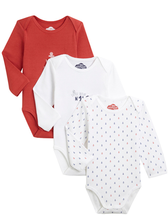 Боди с длинным рукавом фирмы t-a-o (Tape à l'oeil) Франция. Белое с надписью Маленький моряк и рыбкой, красное с якорем и белое с разноцветными якорями по всему боди. Внизу на кнопках. Состав 100% хлопок, размер 0-1мес(54см) 490руб комплект из 3х.