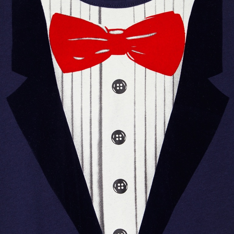 Комбинезончик-фрак фирмы Bluezoo. Трикотажный, темно-синий, внизу расстегивается-застегивается на кнопках. Впереди рисунок рубашка и пуговички, бабочка и лацканы бархатные. Состав 100% хлопок, размеры 0-3мес (56-62), 3-6мес (62-68), 6-9мес (68-74), 9-12мес (74-80), 12-18мес (80-86), 690руб.