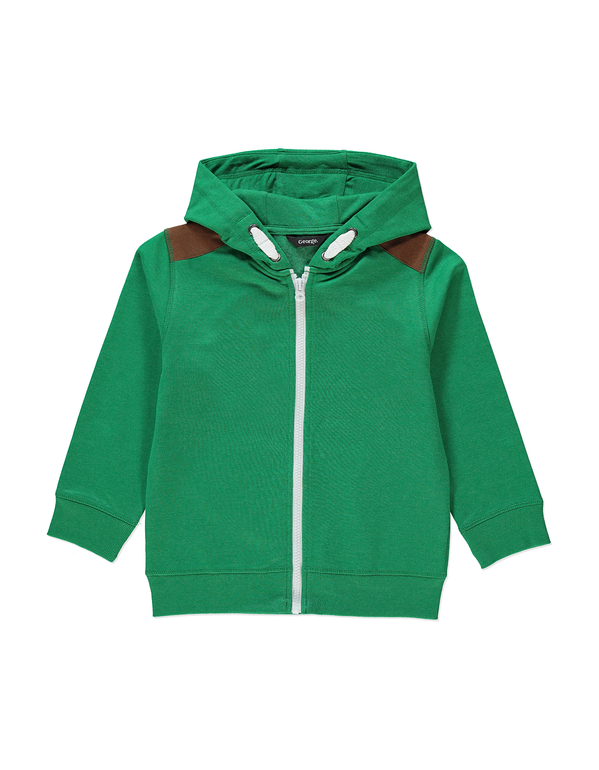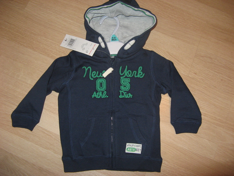 Толстовка с капюшоном фирмы George. Зеленая, с начесом, застежка-молния белого цвета, отделка на плечах коричневая ткань. Состав 60% хлопок, 40% полиэстер. Размеры 9-12мес (74-80), 12-18мес(80-86), 18-24мес (86-92) 590руб.