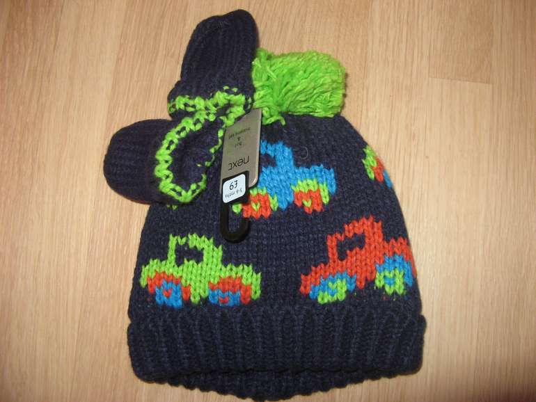 Шапочка с варежками комплект фирмы NEXT. Шапочка мягенькая, теплая, на флисовой подкладке. Вывязаны яркие машины, салатовый помпон. Варежки синие с салатовой отделкой, вывязаны без пальчика. Состав 100% акрил, подкладка 100% полиэстер. Размер 3-6мес, большемерит, 550руб