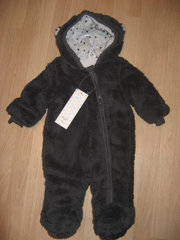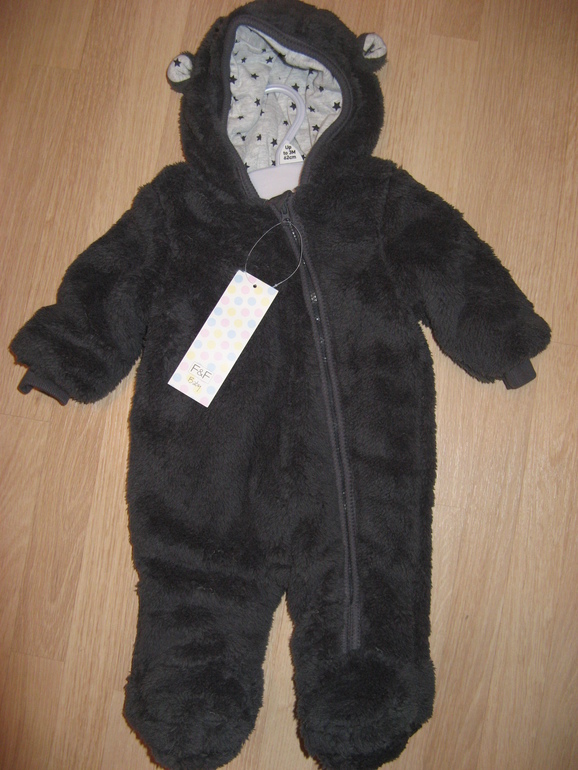 Комбинезончик меховой фирмы F&F. Серый, с трикотажной подкладкой и тонюсеньким утеплетелем, капюшоном с ушками, застежка молния сверху до низа, манжеты на рукавах, ножки закрыты. На прохладное лето и теплую весну.