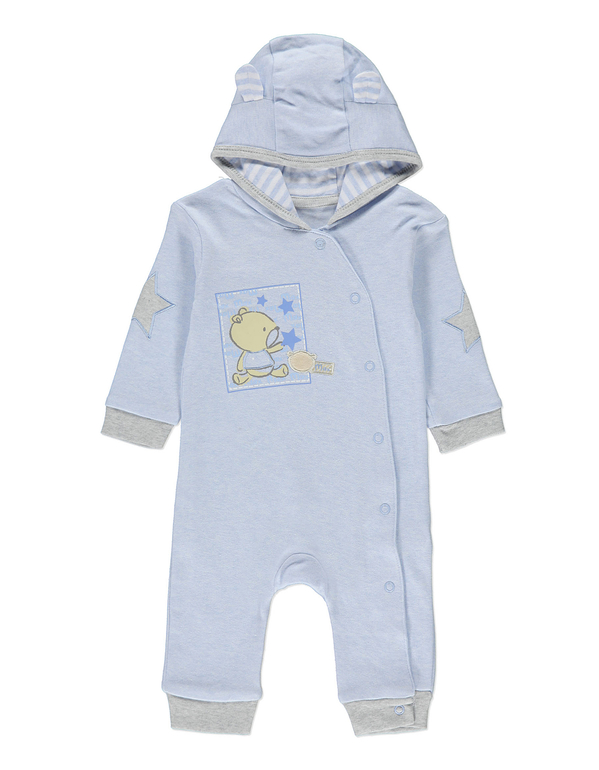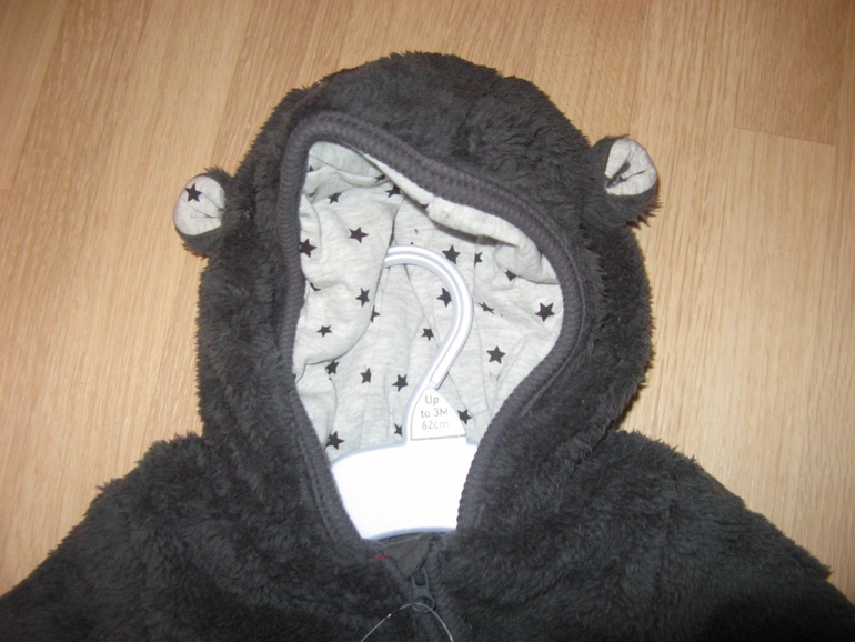 Комбинезончик с капюшоном фирмы George. Голубой, манжеты на рукавах и штанинах, сверху до низа застежка кнопки, Капюшон с ушками на трикотажной подкладке в полоску. На локтях заплатки-звезды, на попе заплатка в полоску, на груди рисунок Мишка. Состав 100% хлопок, размеры 0-3мес (56-62), 3-6мес(62-68), 6-9мес (68-74), 550руб.